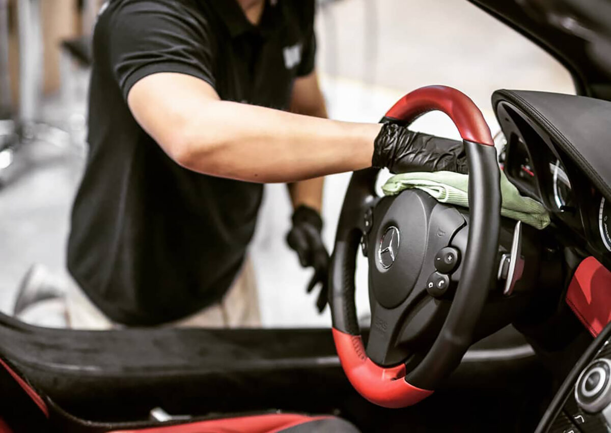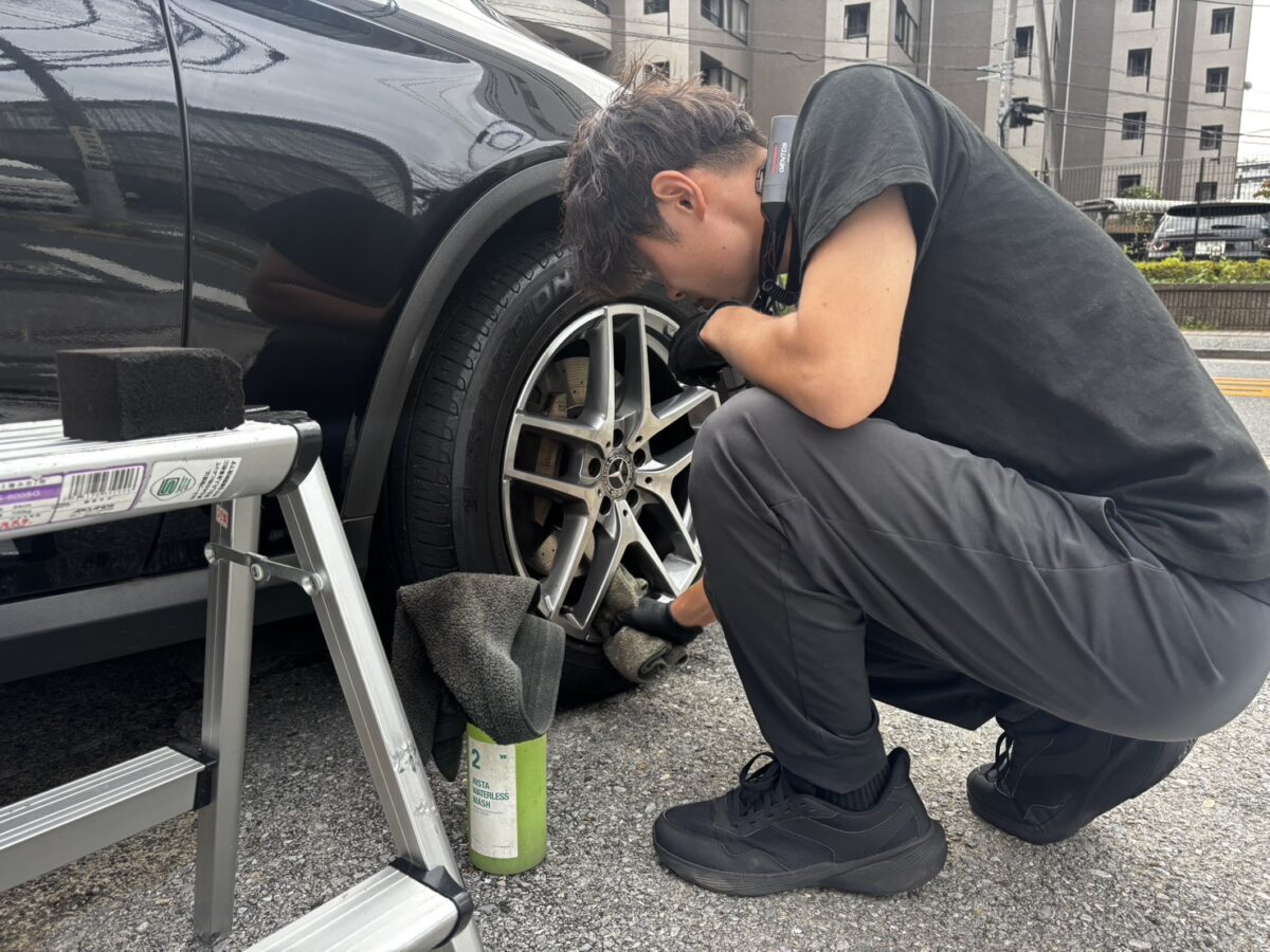 洗車のプロであるマイスターさんが汚れの種類に合わせた専用の洗浄剤を使用し、マイクロファイバータオルで丁寧に拭き取っていきます。
