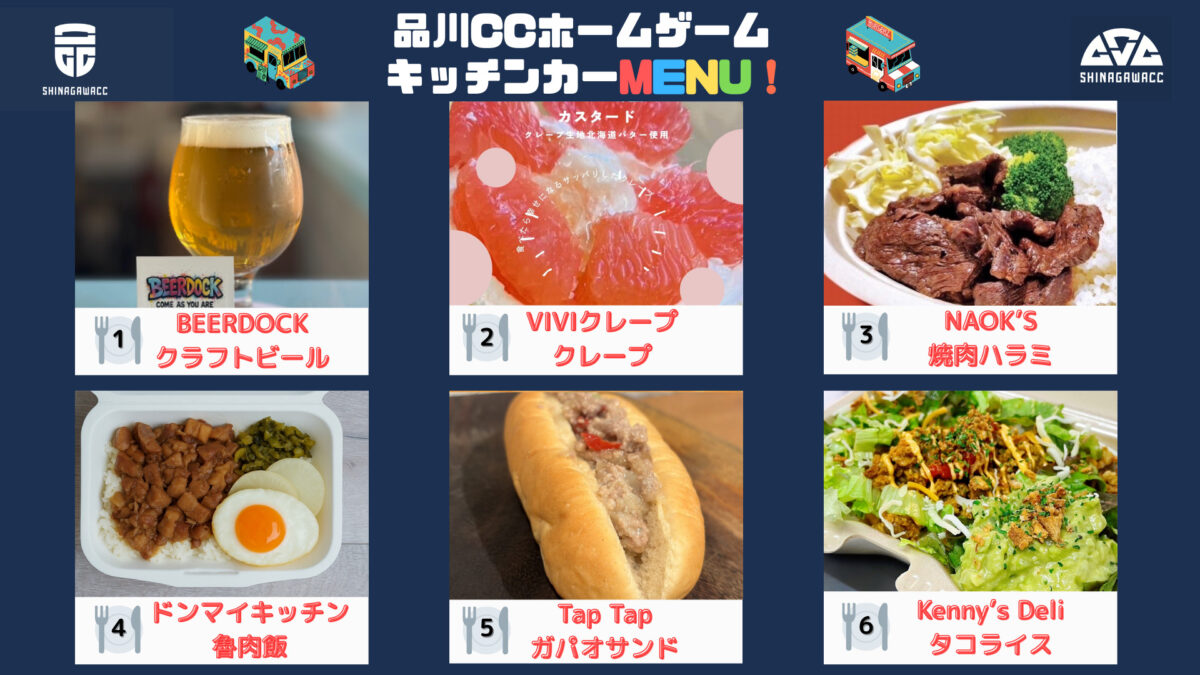 今節限定となる品川CC×BEERDOG 稲田堤 飲食セットの販売の他、当日は試合観戦のお供にお楽しみいただけるフードを多数ご用意しております。