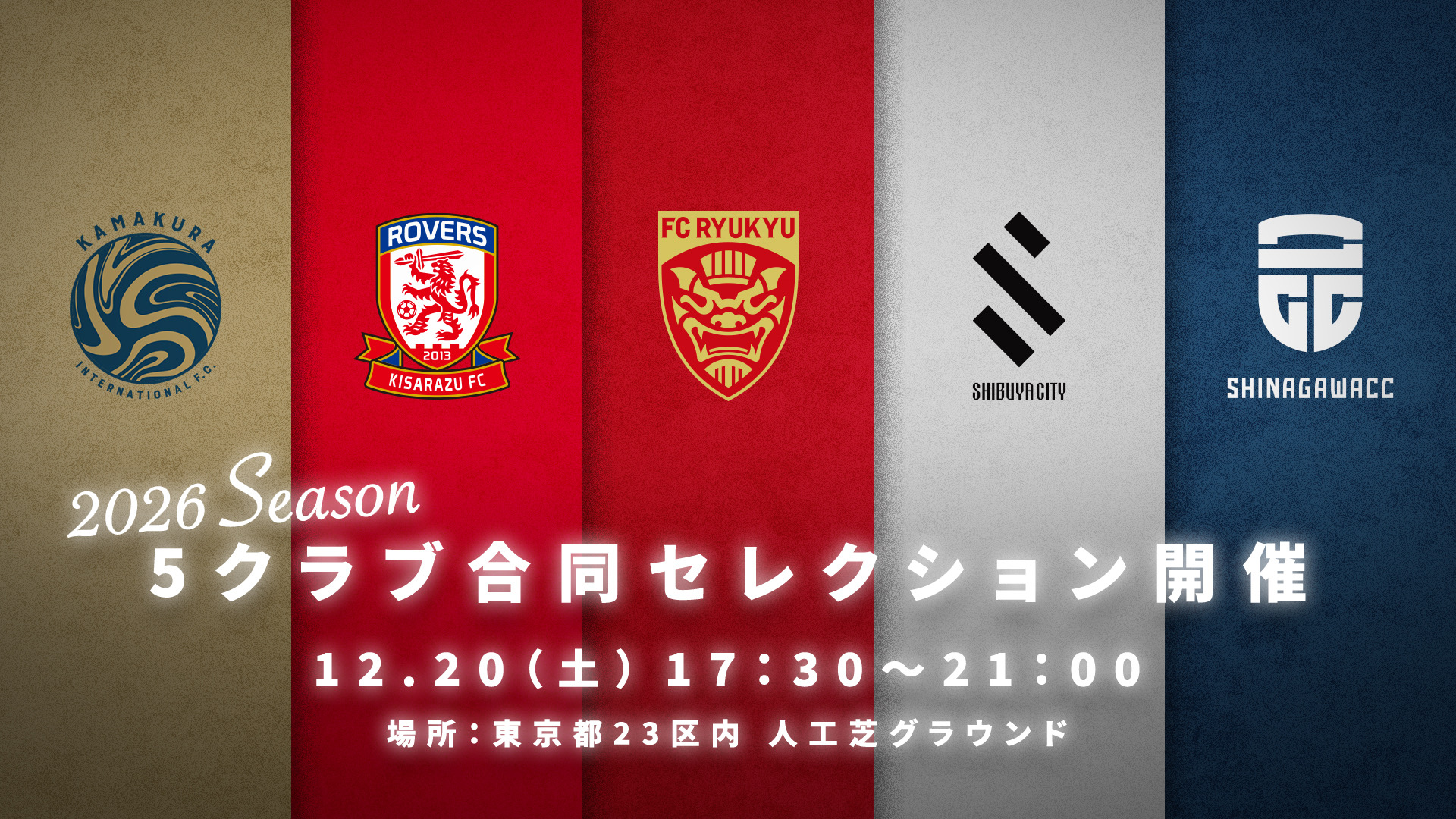 この度、J3リーグ所属のFC琉球、関東サッカー2部リーグ所属(2026シーズンより関東サッカー1部リーグ)のSHIBUYA CITY FC、千葉県社会人サッカー1部リーグ所属の房総ローヴァーズ木更津FC、神奈川県社会人サッカー1部リーグ所属の鎌倉インターナショナルFC、品川CC 5クラブで2026年シーズン 5クラブ合同セレクションを開催することが決定しましたのでお知らせいたします。
