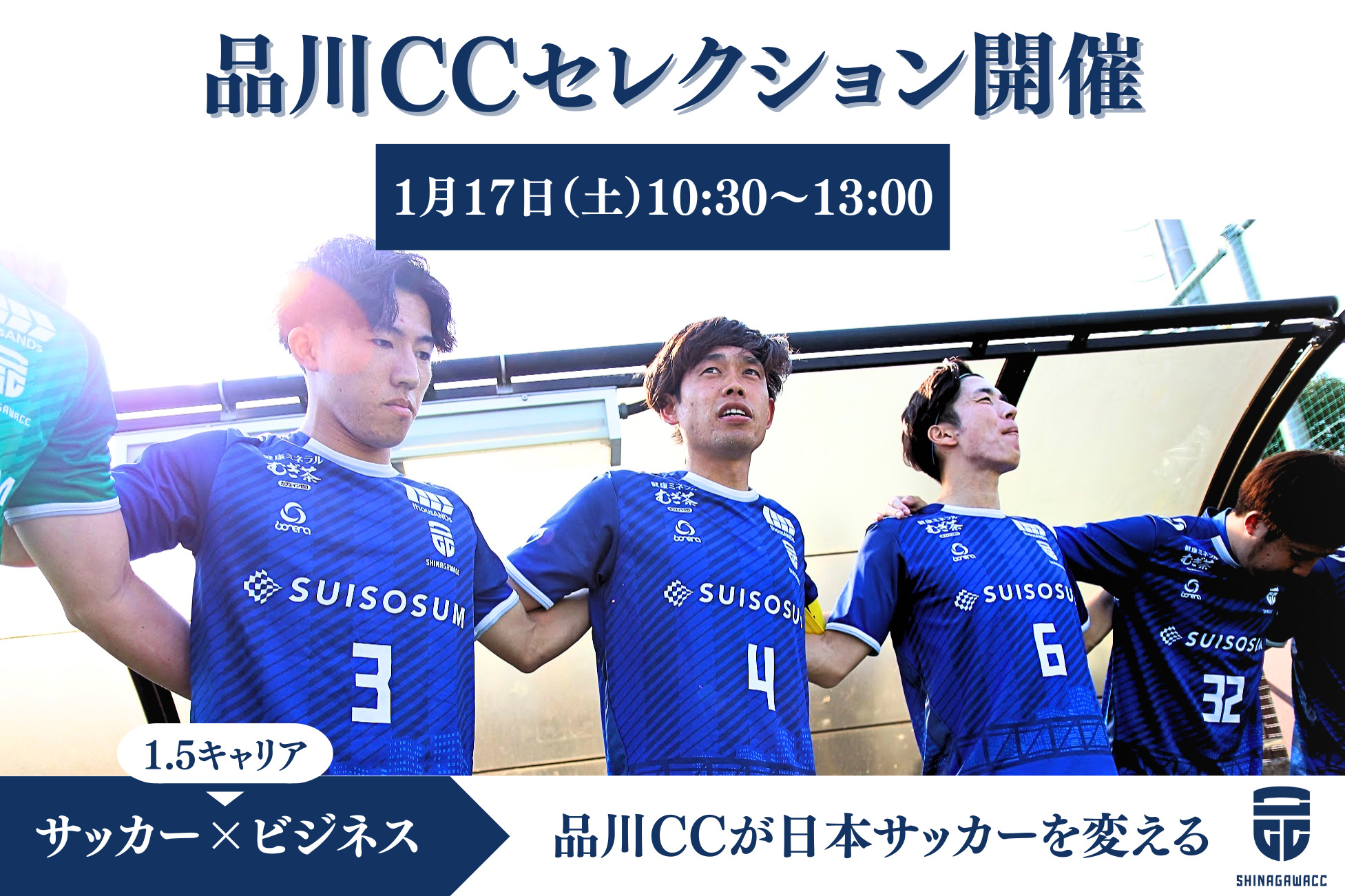 品川CCは、選手のセカンドキャリアの手前である1.5キャリアに着目し、サッカーのみならず、選手の将来を見据えてサポートするチーム運営を行っています。 今ある立ち位置やカテゴリーに関係なく、サッカー選手として社会に価値を発揮することのできる場所。将来性のあるビジネスに携わりながら、サッカーを続けられる環境を品川CCが提供していきます。